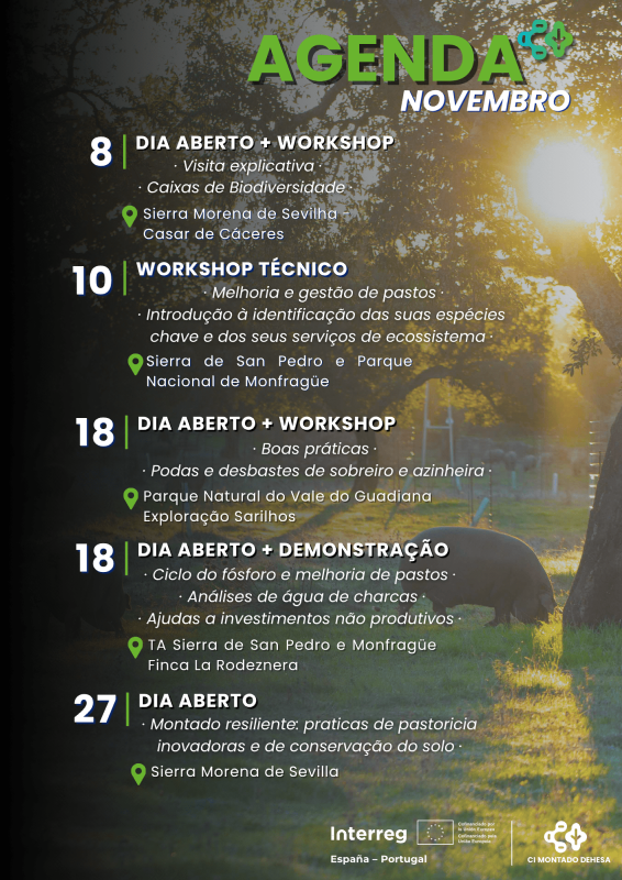 O projeto CI Montado-Dehesa, cofinanciado pela União Europeia através do programa Interreg POCTEP, promove durante o mês de novembro um conjunto de atividades destinadas a disseminar as boas práticas implementadas no projeto e reforçar o conhecimento dos atores nos territórios de intervenção.