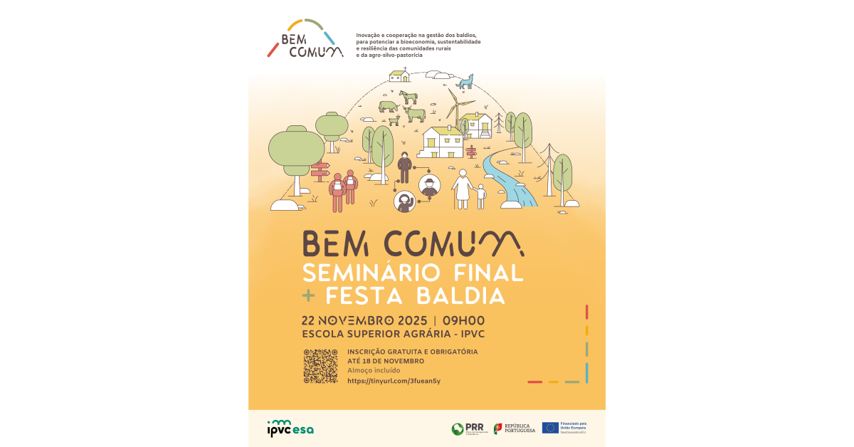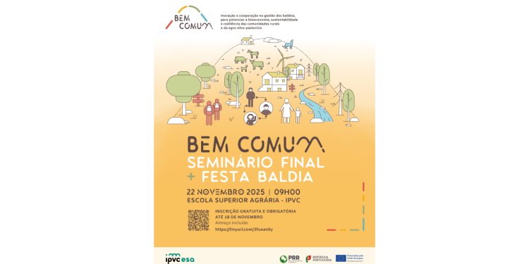 O projeto “Bem Comum” promove no dia 22 de novembro de 2025, na Escola Superior Agrária do Instituto Politécnico de Viana do Castelo (ESA-IPVC), o seu Seminário Final e a Festa Baldia, um encontro que celebra a inovação e a cooperação na gestão dos baldios, potenciando a bioeconomia e a sustentabilidade das comunidades rurais do Norte de Portugal.