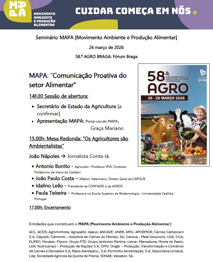 No âmbito da 58.ª AGRO BRAGA, temos o gosto de convidar os vossos estudantes a participar no Seminário MAPA – Movimento Ambiente e Produção Alimentar, que terá lugar no dia 26 de março de 2026, no Fórum Braga.