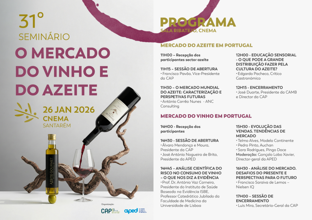 Temos o prazer de convidá-lo(a) para a 31ª Edição do Seminário – O Mercado do Vinho e do Azeite, uma oportunidade para perceber como está o mercado do vinho e do azeite com intervenção de especialistas, bem como, tomar contacto com um ponto de vista científico da questão do Vinho e da Saúde.