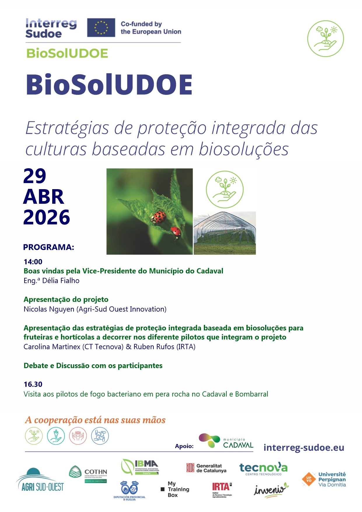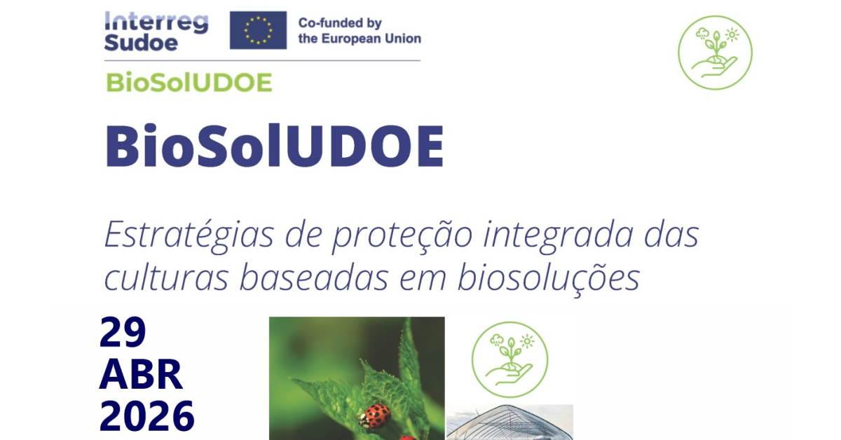 No âmbito do projeto INTERREG Biosoludoe, Estratégias integradas de proteção das culturas baseadas em biossoluções, irá ter lugar uma sessão aberta do projeto destinada a todos os interessados. Nesta sessão serão apresentadas as estratégias que estão em ensaios nos diferentes países que integram o consorcio, Portugal, Espanha e França.