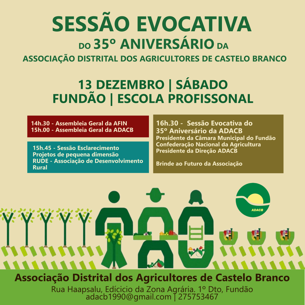 No próximo dia 13 de Dezembro, na Escola Profissional do Fundão, realiza-se a Assembleia Geral da ADACB, seguido de uma Sessão de Esclarecimento sobre “os projetos investimento de pequena dimensão” e de uma Sessão Evocativa dos 35º Aniversário desta Associação.