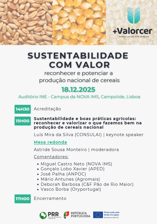 A participação no evento é gratuita, mas sujeita a inscrição prévia, até dia 12 de dezembro, através do seguinte link: SUSTENTABILIDADE COM VALOR: reconhecer e valorizar a produção nacional de cereais – Preencher o formulário.