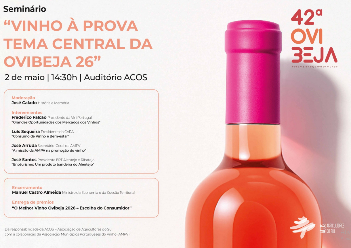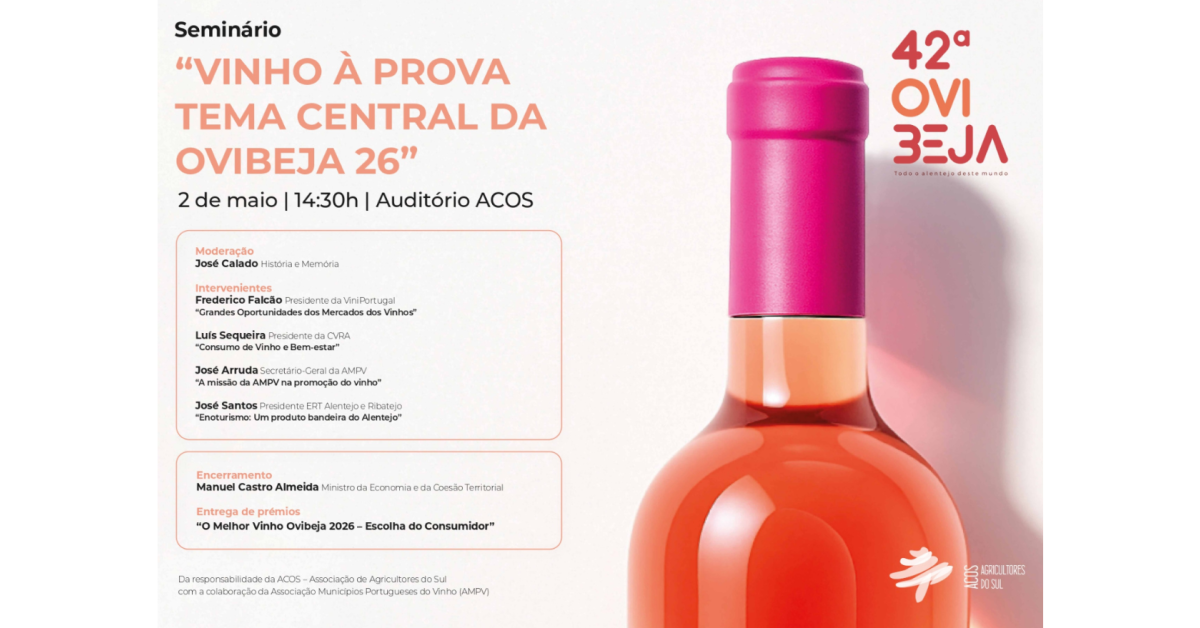 O seminário “Vinho à Prova – Tema Central da Ovibeja 26” decorrerá no dia 2 de maio, às 14h30, no Auditório ACOS. Sob a moderação de José Calado, o painel discutirá o presente e o futuro do setor: