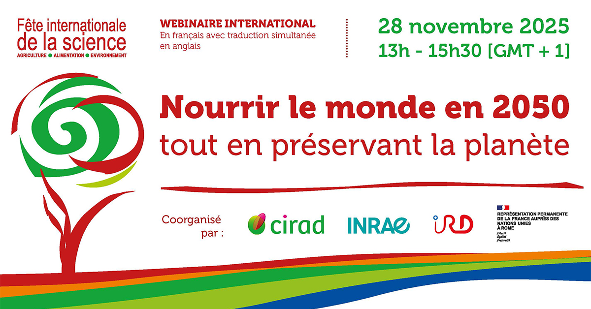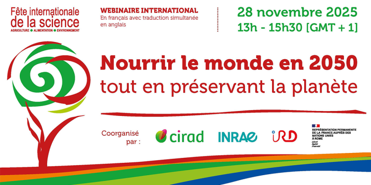 Realiza-se no dia 28 de novembro de 2025, das 13h00 às 15h30 (GMT+1), o webinar Feeding the World in 2050 – Preserving our Planet, dedicado aos desafios globais da segurança alimentar e à transformação dos sistemas alimentares, organizado pelo INRAE, Cirad, IRD e pela Representação Permanente de França junto das Nações Unidas em Roma.