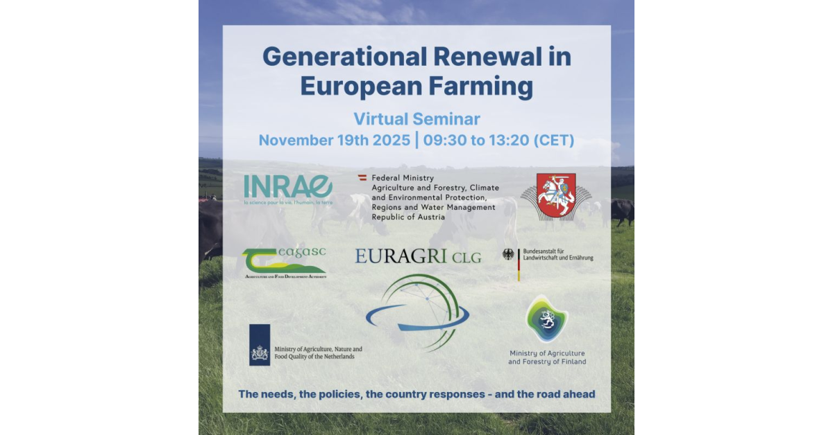 A renovação geracional na agricultura é um dos grandes desafios para o futuro das zonas rurais na Europa. Este tema estará em debate no webinar “Generational Renewal in European Farming”, a realizar-se no dia 𝟭𝟵 𝗱𝗲 𝗻𝗼𝘃𝗲𝗺𝗯𝗿𝗼 𝗱𝗲 𝟮𝟬𝟮𝟱, entre as 𝟬𝟵:𝟯𝟬 e as 𝟭𝟯:𝟮𝟬 (𝗖𝗘𝗧) [8:30-12:30 em PT]
