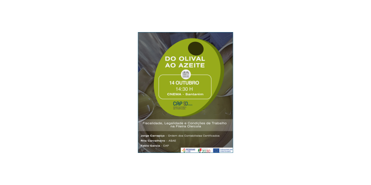 Neste âmbito, a CAP irá promover uma sessão sobre Fiscalidade, Legalidade e Condições de Trabalho na Fileira Oleícola , onde contaremos com a presença da OCC – Ordem dos Contabilistas Certificados e da ASAE – Autoridade de Segurança Alimentar e Económica.