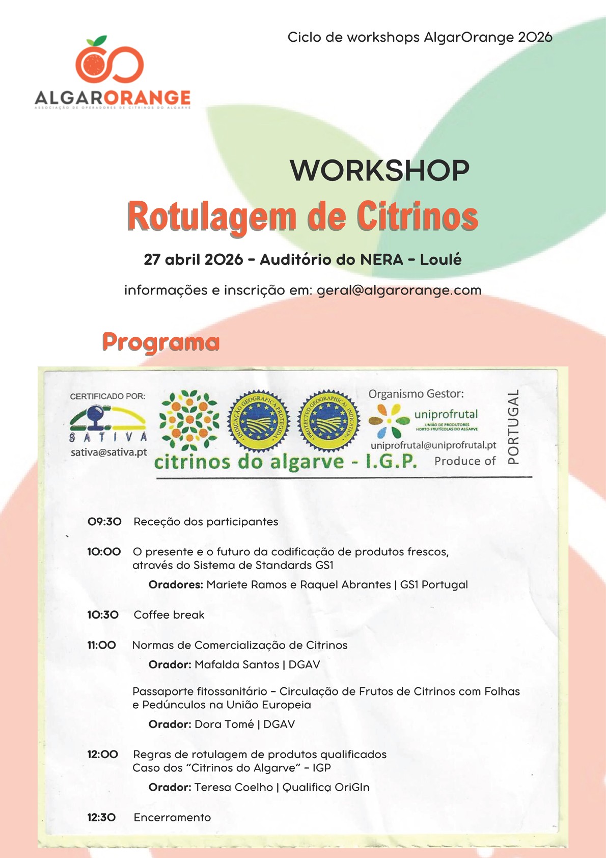 Nesta sessão, iremos abordar a codificação no sistema GS1, as normas de comercialização, o passaporte fitossanitário na UE e as regras de rotulagem com destaque para os “Citrinos do Algarve” IGP.