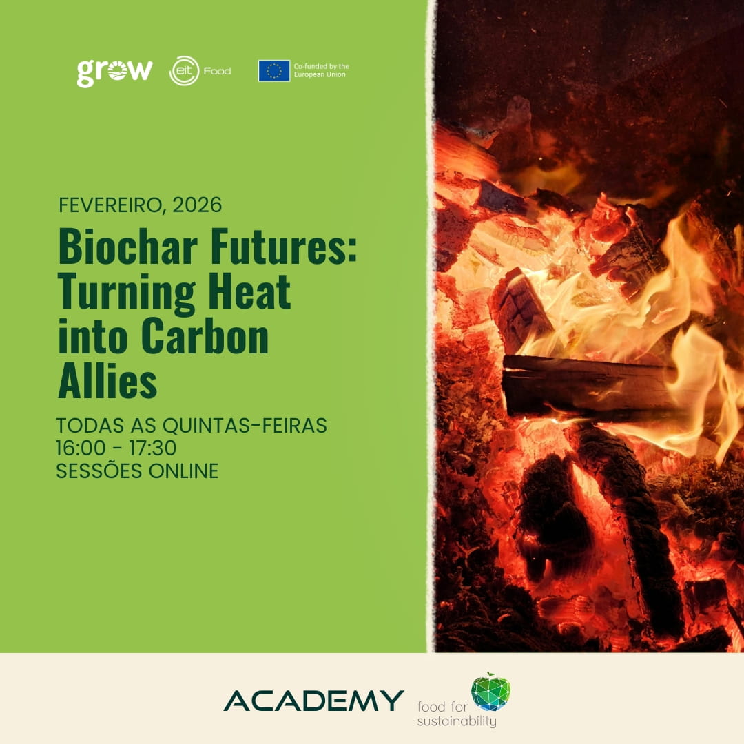 O Food4Sustainability Academy, no âmbito do programa Grow, lança o 2.º Ciclo de Webinars “Biochar Futures: Turning Heat into Carbon Allies”, que irá decorrer todas as quintas-feiras do mês de fevereiro das 16h00 às 17h30 (hora de Portugal). Num contexto de urgência climática e necessidade de regenerar solos degradados, este ciclo destaca o biochar como solução estratégica para sistemas agrícolas mais resilientes e sustentáveis.
