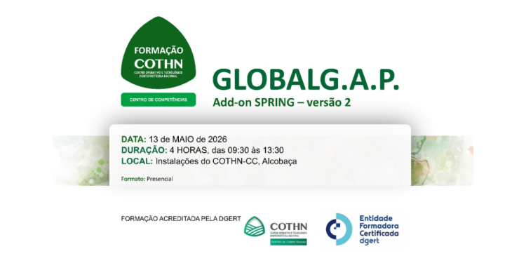 O COTHN-CC está a organizar uma ação de formação em GLOBALG.A.P. Add-on SPRING – versão 2 para o dia 13 de maio de 2026. Esta ação decorrerá presencialmente nas instalações do COTHN-CC em Alcobaça, entre as 09:30 e as 13:30.