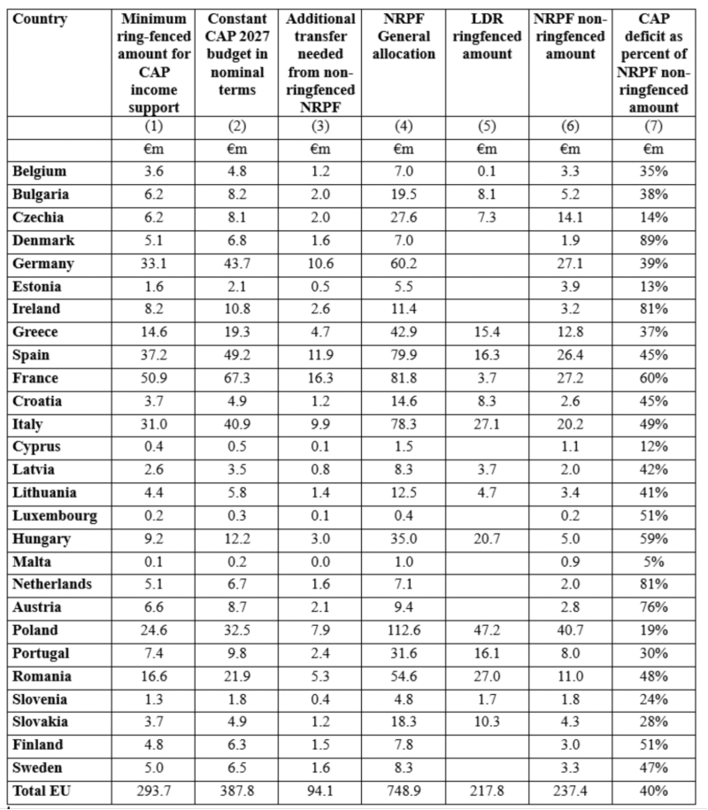 The IDDRI brief gives a very clear exposition of the controversies that have erupted around the likely CAP budget. My contribution in this blog post has been to show that Member States have very different scope for making additional transfers from the unearmarked component of the NRP Fund to top up the minimum ringfenced budget for CAP income support interventions. For some countries, bringing the CAP budget up to the 2027 level in current prices in the next programming period would require 75% or more of the unearmarked amounts; for other countries, it could require less than 20% of the unearmarked amounts.
