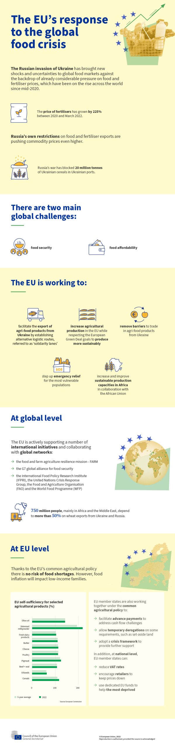 The Council has addressed the worsening food security crisis since the onset of the war. EU measures aim to help European and global citizens, in particular the most vulnerable, to have enough nutritious food at affordable prices.