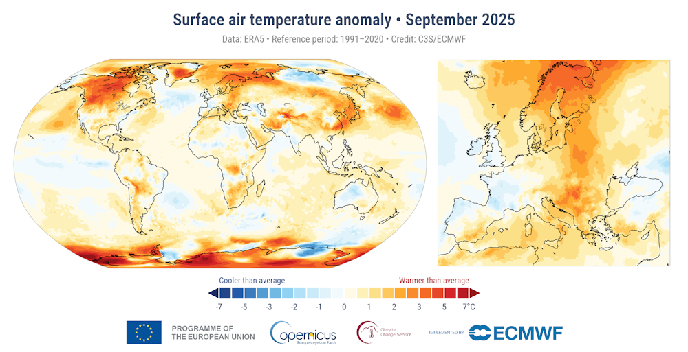 Setembro de 2025 foi 0.66 °C mais quente do que a média no período de 1991-2020, com uma temperatura média do ar à superfície de 16.11 °C (Figura 1), sendo o 3º setembro mais quente de que há registos. Foi o sexto mês nos últimos 27 meses em que a temperatura média global foi inferior a 1.5°C em relação aos níveis pré-industriais, tendo registado uma anomalia de +1.47ºC.