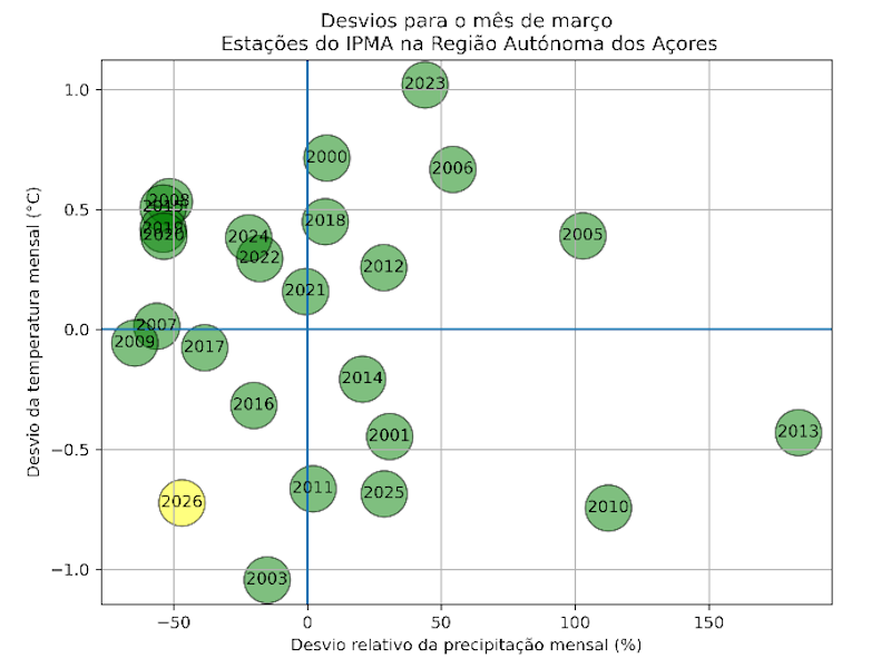 Complementarmente, a relação entre os desvios médios das temperaturas do ar e dos desvios relativos das quantidades de precipitação nas estações do IPMA dos Açores, identificaram março de 2026 como frio e seco.