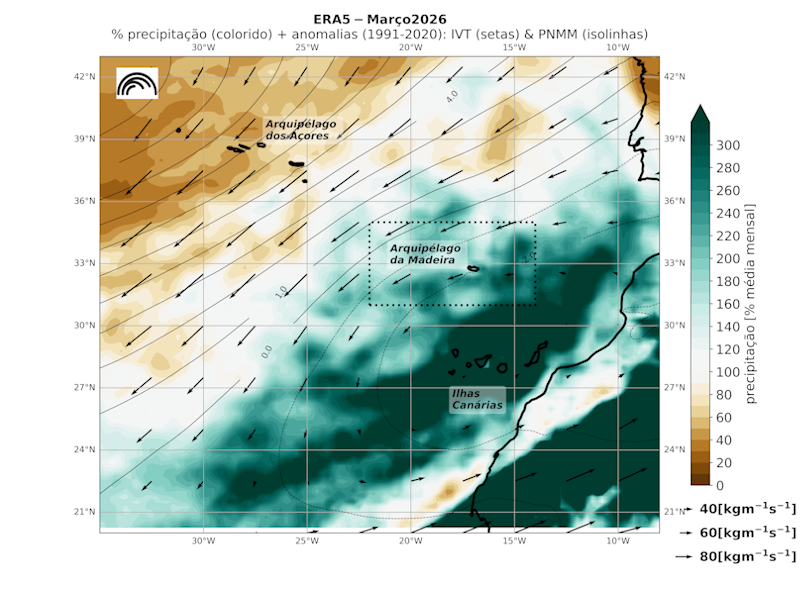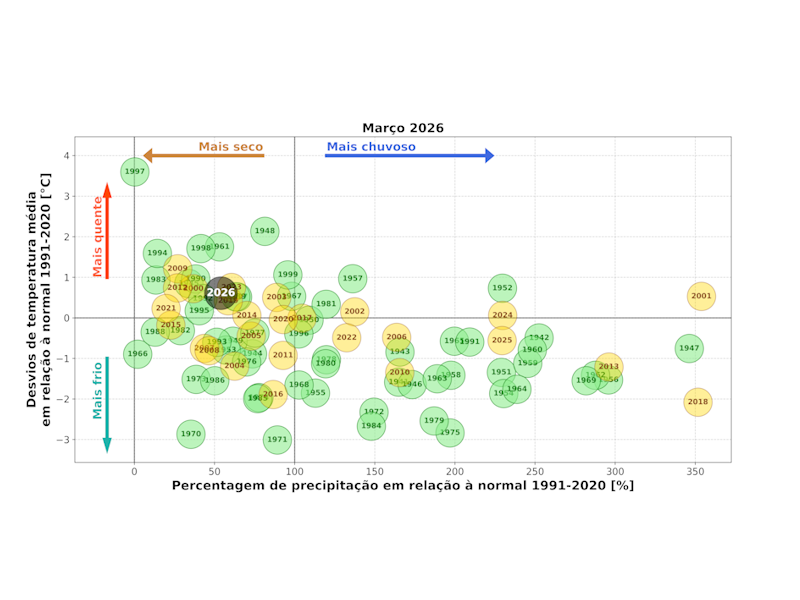 O mês de março de 2026 caracterizou-se por uma temperatura média do ar inferior ao valor da normal (período de referência 1991–2020) e por quantidades de precipitação acumulada acima da normal.