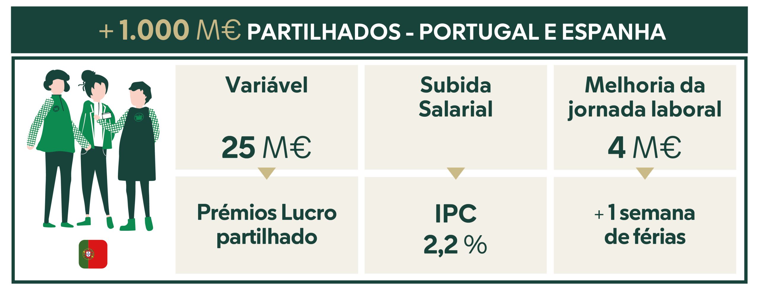 Também foi realizado um aumento salarial para acompanhar o aumento do IPC, de 2,2% em Portugal e de 2,9% em Espanha, o que implica 125 milhões de euros por ano. Além disso, no passado mês de dezembro, foi anunciada a melhoria da jornada de trabalho com o aumento do período de férias em mais uma semana para os trabalhadores, que, atualmente, em Portugal passam a disfrutar de até 29 dias úteis. Esta medida, em vigor desde o presente exercício tanto em Portugal como em Espanha, representa uma grande melhoria na jornada dos trabalhadores e tem um custo anual de 100 milhões de euros, dos quais 4 milhões correspondem a Portugal.