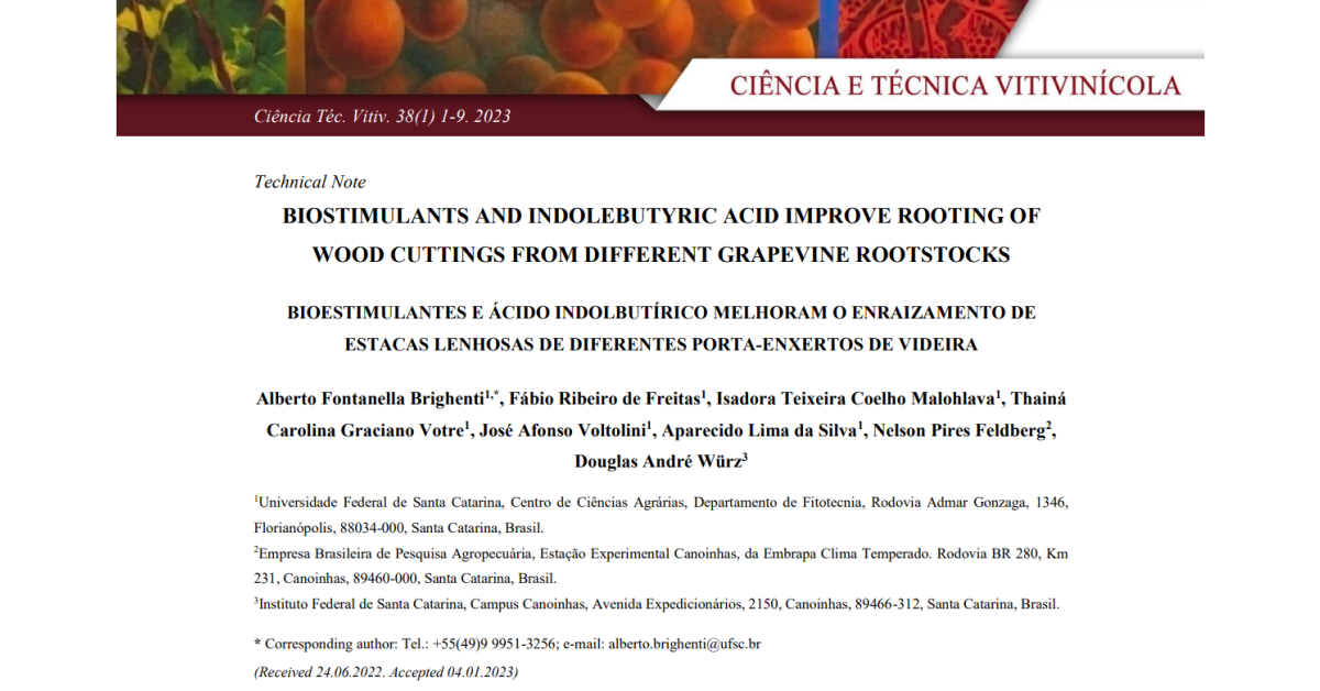 O enraizamento de porta-enxertos de videira é considerado um ponto crítico na produção de material de propagaçao de alta qualidade. Para maximizar o processo de rizogênese, hormônios vegetais, como as auxinas, são utilizados para o desenvolvimento de raízes adventícias. Além disso, alguns grupos de bioestimulantes têm como principal função o desenvolvimento do sistema radicular das plantas, garantindo o bom crescimento da parte aérea. No entanto, pesquisas utilizando bioestimulantes à base de extrato de algas na propagação vegetativa de porta-enxertos de videira são escassas. O objetivo deste trabalho foi avaliar o uso de bioestimulante à base de extrato de algas e do ácido indolbutírico (AIB), no desenvolvimento do sistema radicular e do crescimento vegetativo de porta-enxertos de videira. Os porta-enxertos avaliados foram ‘3309 C’, ‘101-14 Mgt’, ‘Paulsen 1103’, ‘99 R’, ‘110 R’, ‘Kober 5BB’, ‘SO4’, ‘420A Mgt’, ‘Solferino’, ‘Gravesac’, ‘IAC 572’, ‘IAC 766’, ‘IAC 313’, ‘Harmony’, ‘Freedom’, ‘Salt Creek’ e ‘VR 043-43’. O delineamento experimental utilizado foi inteiramente casualizado com quatro repetições, em um esquema bifatorial, envolvendo 17 porta-enxertos associados a quatro tratamentos para estimular o enraizamento (AIB, extrato de algas, AIB + extrato de algas e testemunha). O uso de AIB e bioestimulante à base de extrato de algas mostrou-se eficiente no enraizamento de estacas lenhosas de diferentes porta-enxertos de videira. O AIB, o extrato de algas e o uso combinado de AIB e extrato de algas resultou em maiores taxas de enraizamento e desenvolvimento de estacas quando comparados com o controle. Os porta-enxertos que apresentaram as maiores taxas de enraizamento e desenvolvimento vegetativo foram o ‘IAC 572’ e o ‘Freedom’. ‘Gravesac’, ‘101-14 Mgt’ e ‘99 R’, apresentando altas taxas de enraizamento e desenvolvimento radicular, mas baixo desenvolvimento vegetativo. Os porta-enxertos que exibiram menores taxas de enraizamento e desenvolvimento vegetativo foram ‘Salt Creek’, ‘VR 043-43’ e ‘110 R’.