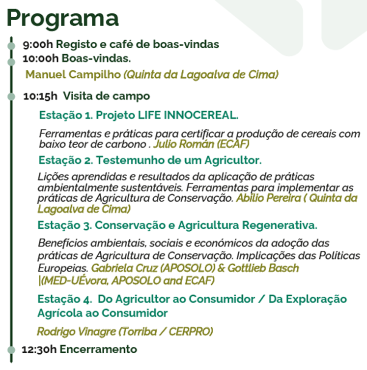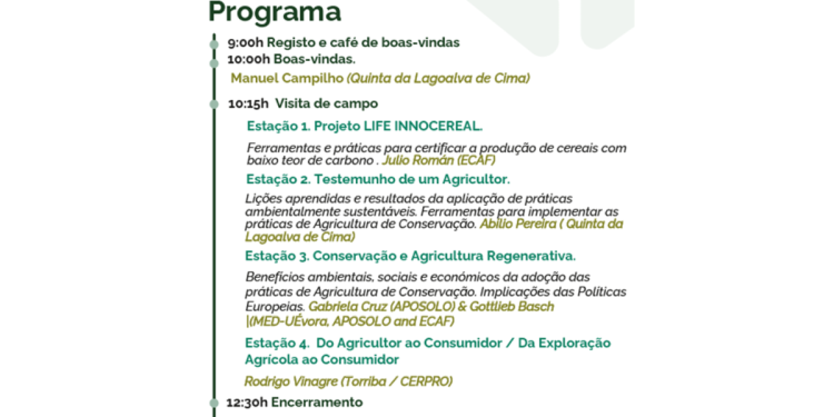 Nessa manhã serão mostrados os progressos realizados no projeto, partilhadas as experiências dos agricultores na adoção de práticas sustentáveis para a produção de cereais de baixo teor de carbono, e refletir-se-á sobre o futuro da respetiva certificação. Os trabalhos contribuirão também para a adoção das práticas de Agricultura de Conservação e Regenerativa – ver Programa.