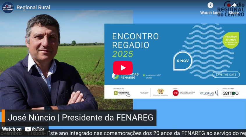 Hoje no REGIONAL RURAL …. José Núncio, Presidente da FENAREG fala-nos das XVI Jornada FENAREG: Encontro do Regadio 2025 – 6 de novembro – Lisboa e dos 20 anos da instituição. FENAREG – Federação Nacional de Regantes de Portugal está a organizar o Encontro do Regadio 2025 – XVI Jornada da FENAREG, este ano integrado nas comemorações dos 20 anos da FENAREG ao serviço do regadio. O evento irá decorrer no dia 06 de novembro, no Auditório do LNEC, em Lisboa.