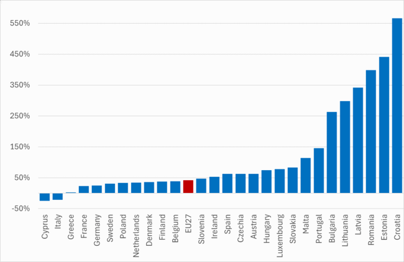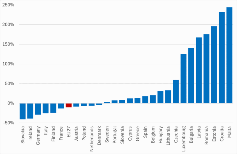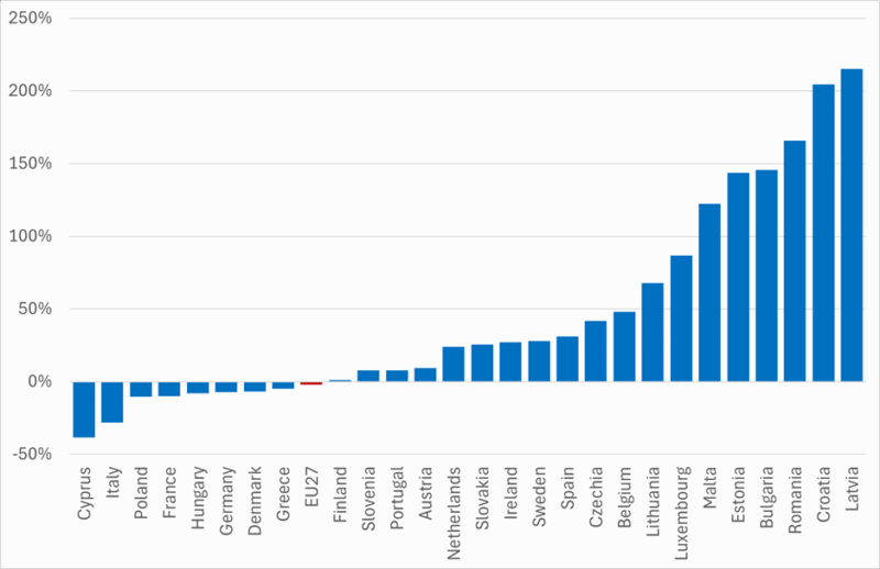 We start by examining the growth in the capital stock. Figure 1 shows the change in the net capital stock in chain-linked volume in the sector ‘Agriculture, forestry and fishing’ (AFF) between 2005 and 2022 (see the data appendix at the end of the post for further explanation). Data for some countries are available up to 2024 but not all, so I have restricted the period to 2005 to 2022. For the EU27 as a whole, there has been almost no change in the volume of the sector’s capital stock. However, the range of country experiences is extraordinary. Countries to the left of the EU column in Figure 1 have been decapitalising, while countries to the right have been adding to their capital stock over this period. If we arbitrarily draw a line between Belgium and Hungary, the countries from Hungary and further to the right in Figure 1 where net investment has been particularly marked are all countries that joined the EU in 2004 or after (except for Luxembourg). Latvia and Croatia have more than trebled their capital stock over this period. There are exceptions. Slovenia and Cyprus have increased their capital stock at a much slower pace, while Poland has seen a decrease in its capital stock. What explains these very different experiences with respect to capital formation deserves a separate investigation.