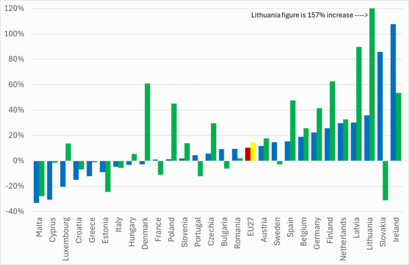While the overall growth in the volume of EU GVA and for some countries is reasonably similar in the two series, there are striking differences for most countries. The most dramatic difference is for Slovakia, which reports almost a doubling (86% increase) in its GVA volume in the National Accounts but a 31% decrease in the EEA! Other countries which show significant divergences include Lithuania (36% as against 157%), Denmark (-3% as against 61%), Ireland (108% as against 53%), Lativa (30% as against 90%), Finland (26% as against 63%), and Poland (1% as against 45%). When we observe such extraordinary differences for estimates of the growth in output for two very similar series, it calls into question how to interpret any productivity growth figures based on these estimates. It is clear the reason for these differences deserves interrogation.