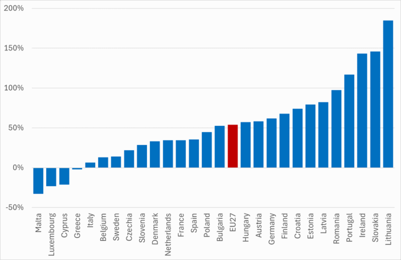 Analogous to capital productivity, we can also calculate a measure of labour productivity, defined as the output (measured as gross value added) in the AFF sector divided by the number of hours worked in the sector (see data appendix at the end of this post for a justification). Figure 4 shows the growth in labour productivity in Member States over the period 2005-2022 and, again, huge heterogeneity is evident. In four countries, the growth in labour productivity has been negative. Each hour spent at work in farming in these countries contributed less in 2022 than it did in 2005, which is a remarkable finding. There are another three countries – Italy, Belgium and Sweden – where the percentage growth over the period is less than 20%, or less than 1% per annum. Those countries to the right of the graph show above-average increases in labour productivity. There is a much less distinctive pattern in the growth of labour productivity between old and new Member States in Figure 4. While new Member States are to be found to the right of the chart, so are countries such as Ireland, Portugal, Finland and Germany, while countries such as Malta, Cyprus, Czechia, Slovenia, Poland and Bulgaria have below EU-average growth in labour productivity.