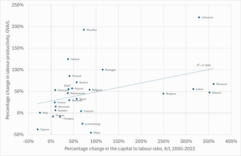 Figure 7. Correlation between the percentage change in labour productivity and change in the capital-labour ratio in the Agriculture, Forestry and Fishing sector between 2005 and 2022.