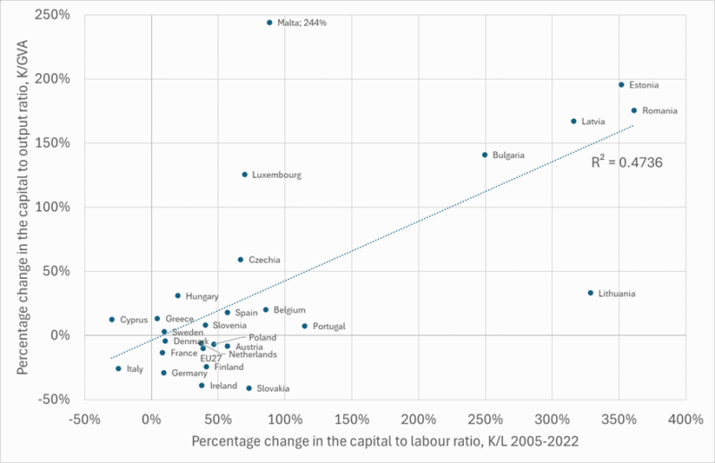 Further insights are gained if we mentally divide the X-Y graph into four quadrants at the (0,0) point. In the bottom right-hand quadrant are those countries (mostly the older Member States) where the capital-labour ratio has been increasing but the capital intensity of production has been decreasing (capital productivity increasing). These are countries where capital deepening has been efficient in that output per unit of capital has been maintained or improved.