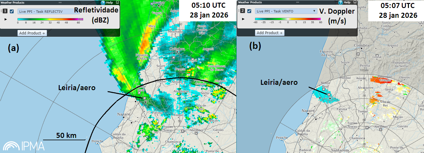 Figura 2 – (a) Imagem de PPI de refletividade (baixa elevação), 05:10 UTC. Visível o padrão da extremidade da massa nebulosa da tempestade Kristin no campo da refletividade (Sting) e assinalado o local da estação Leiria/aeródromo. (b) Imagem de PPI de velocidade Doppler (baixa elevação), 05:07 UTC. Assinalado o local da estação Leiria/aeródromo. Alcance deste produto (100 km) referenciado a circulo preto em (a). O máximo da velocidade Doppler observada (b) coincide com a extremidade da massa nebulosa (a), no momento em que a estação indicada observava a rajada máxima. Radar de Coruche/Cruz do Leão 28 de janeiro de 2026.